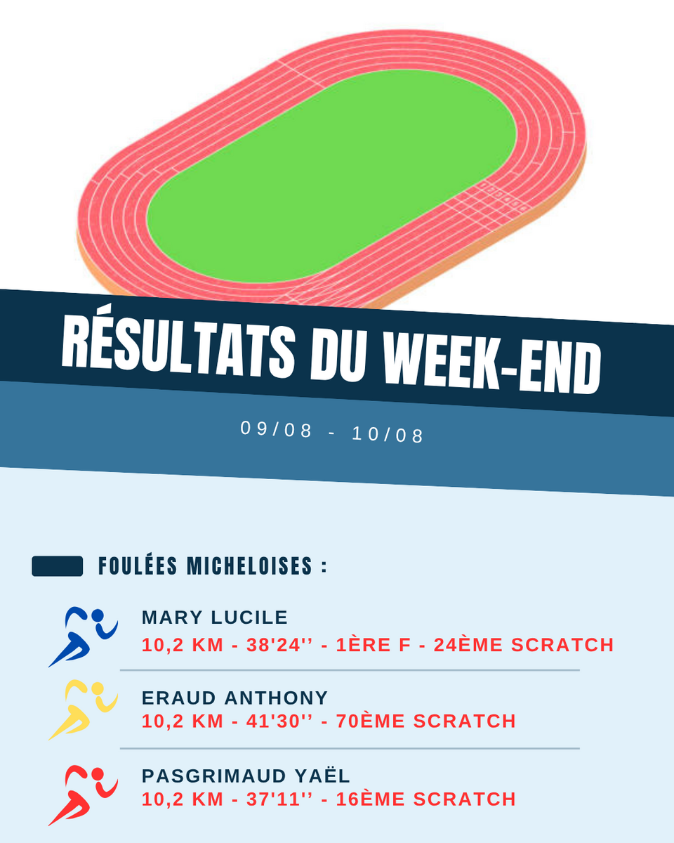 Voici la reprise des articles des résultats du week-end. Au programme, virée sur la plage pour trois de nos athlètes de l’ENL44, qui se sont alignés sur les 10,2 kilomètres des foulées micheloises. Félicitations à Lucile, qui clôture sa saison en beauté en s’arrachant la première place chez les féminines. Voici les résultats :