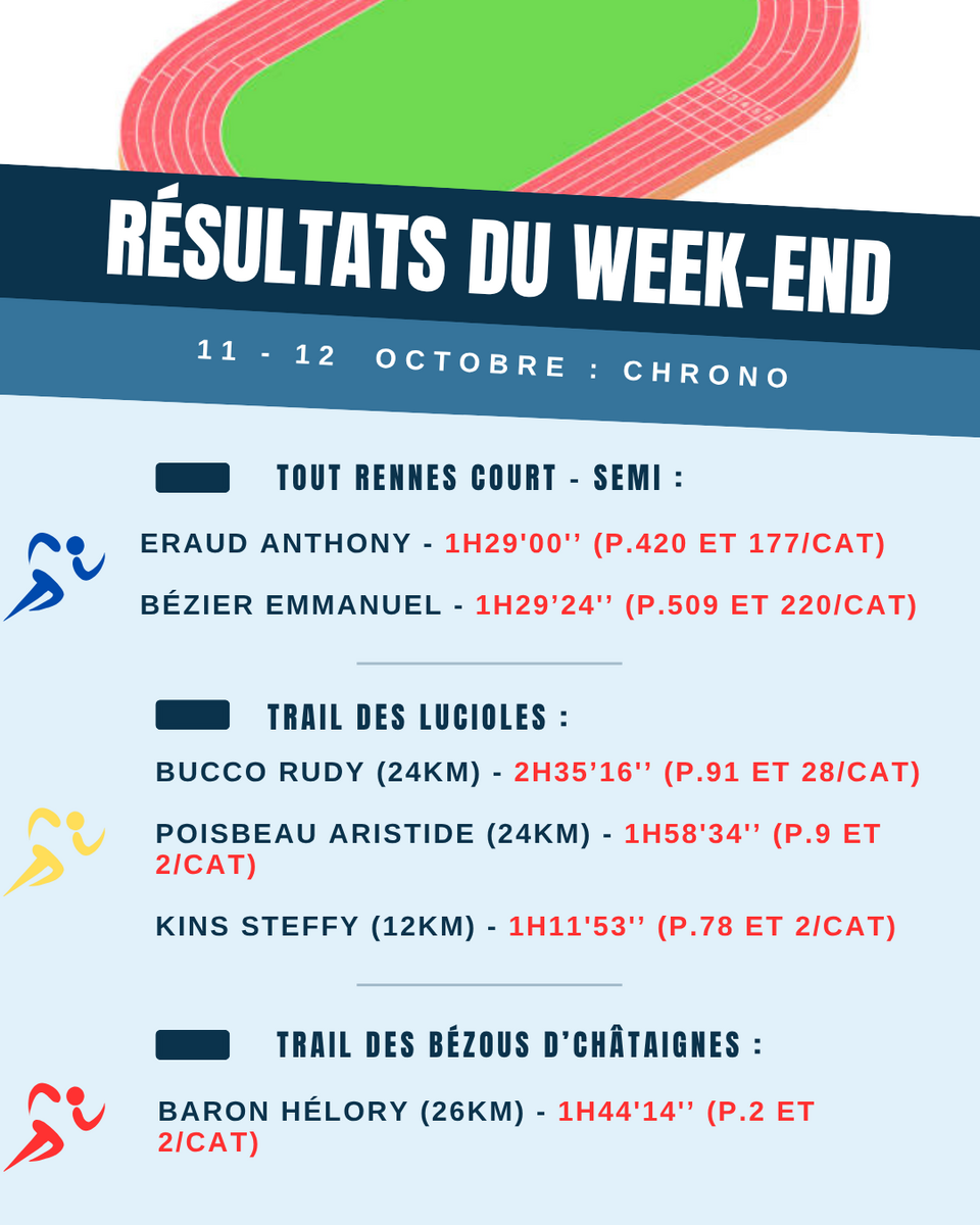 voici le récapitulatif des résultats du week-end (11 et 12/10) pour les athlètes de l’ENL44. Les athlètes se sont illustrés principalement sur trail mais aussi sur route et triathlon. Mention spéciale aux infatigables Steffy et Aristide, qui enchaînent non seulement les courses depuis plusieurs semaines mais également plusieurs courses au sein du même week-end. Dédicace également à Helory qui semble avoir trouvé son terrain de prédilection. Les résultats en détails :