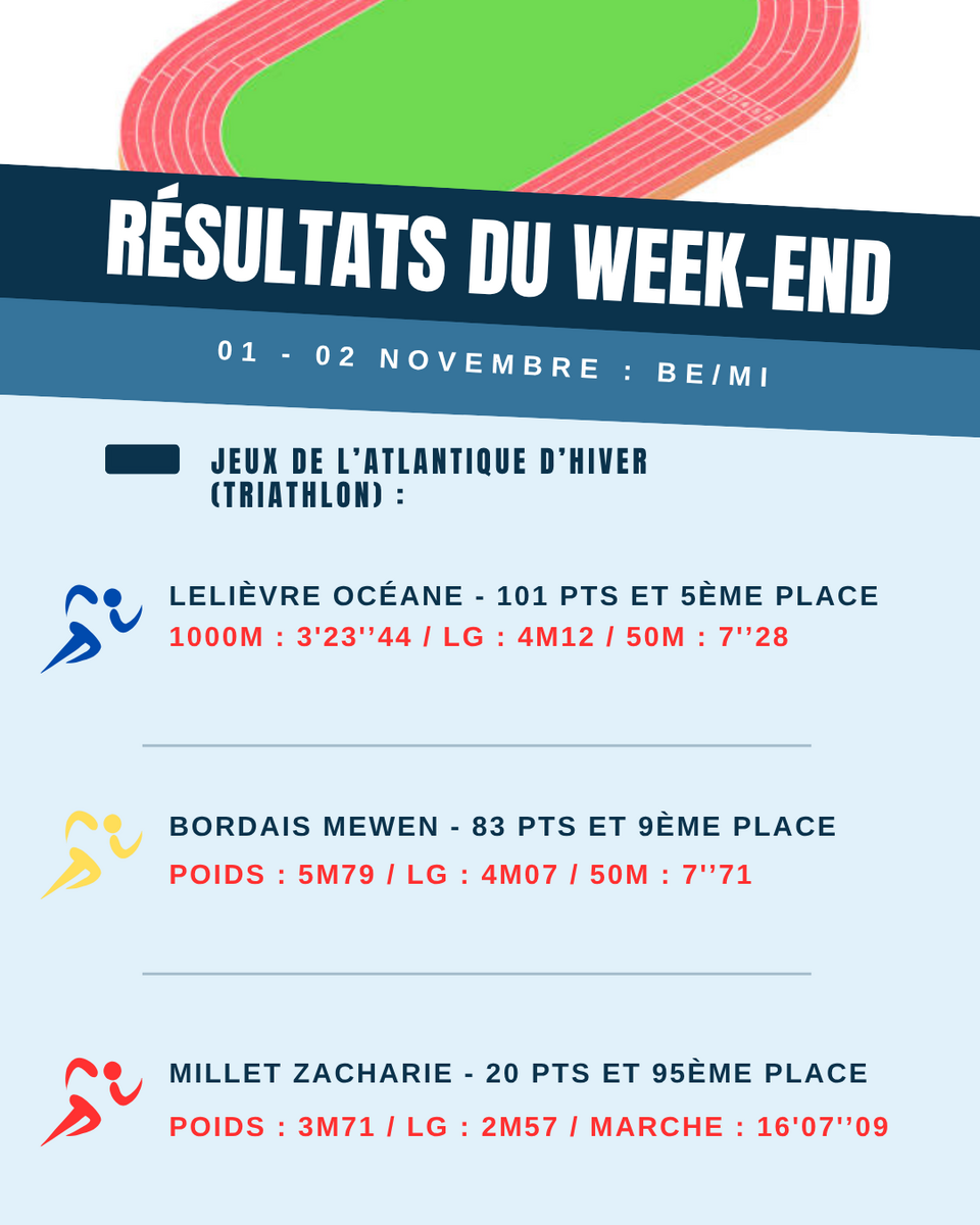 Voici les résultats du week-end (01-02/11) pour les athlètes de l’ENL44. Au planning, de l’indoor, du trail et du RP sur route. Je vous laisse découvrir les performances en détails :